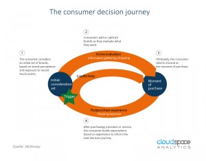 Im Lifecycle Marketing befindet sich der Kunde nicht notwendigerweise in einem Trichter. Die decision-making journey, wie sie von McKinsey vorgelegt wurde, erklärt den Entscheidungsprozess der Konsumenten als eine Art Schleife innerhalb einer Schleife, beginnend mit einer anfänglichen Kaufentscheidung, die in einem Bindungszyklus nach einer Transaktion mündet.